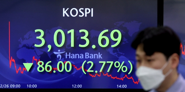 이미지 확대보기26일 한국거래에 따르면 코스피는 전날 대비 2.80%(86.74포인트) 내린 3012.95에 거래를 마쳤다.