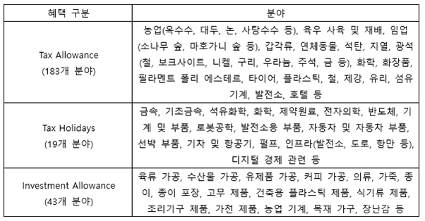 우선투자분야는 국가 전략 육성 산업 및 프로젝트, 노동 및 자본집약산업, 첨단기술산업, 선도산업, 수출지향산업, 연구개발 산업 등의 조건을 만족하는 분야다. 이번 시행령에서는 우선투자분야에 대한 금전적 인센티브 및 비금전적 인센티브를 제공하도록 하고 있다. 금전적 인센티브로는 각종 세제상 혜택(Tax Holiday, Tax Allowance, Incentive Allowance 등)이 있고, 비금전적 인센티브로는 신속한 사업 인허가 지원, 에너지 사용 보장, 고용 편의 등이 명시돼 있다. 금전적 및 비금전적 인센티브는 제반 법령의 규정에 따라 실시될 것이므로, 구체화 하위 규정들이 추가로 마련될 것으로 예상된다.