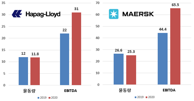 하파그로이드(Hapag-Lloyd)가 2021년 1월 발표한 2020년 실적 잠정치를 살펴보면 동사의 컨테이너 물동량은 팬데믹 여파 속 2020년 1,180만 TEU를 기록하여 2019년 1,200만 TEU에 비해 약 1.6% 감소하였다. 그러나 운임 상승 속 매출액은 146억 달러를 기록해 오히려 2019년 141억 달러보다 3.5% 상승하였으며, 특히 실질적인 영업활동의 성과를 나타내는 감가상각전 영업이익(EBITDA)은 2019년 22억 달러에서 2020년 31억 달러로 약 41% 급증하였다.