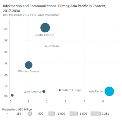 아태지역은 2013년부터 2017년까지 경제 현대화와 역내 서비스 부문의 성장에 힘입어 세계 전체 산업 성장의 ⅔를 차지하였으며, 2017년을 기점으로 아태지역은 정보통신(ICT) 산업 매출액은 2조2000억 달러를 기록하며 북미를 능가하는 세계 선도지역이 되었다. 특히, 아태지역 내 경제 발전에 대한 ICT산업 중요도가 지속적으로 높아질 것으로 예상됨에 따라 점유율은 연간 6% 증가해 2030년에는 45%로 성장할 것으로 전망된다.