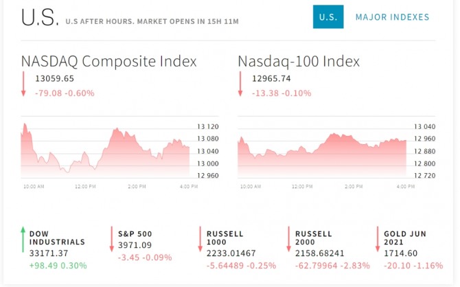 이미지 확대보기30일 미국 뉴욕증시에 따르면 다우존스30 산업평균지수는 헤지펀드의 대규모 블록딜 여파에도 사상 최고치를 기록했다. 뉴욕증권거래소(NYSE)에서 다우존스30 산업평균지수는 98.49포인트(0.30%) 오른 33,171.37에 장을 마감했다. 스탠더드앤드푸어스(S&P) 500 지수는 전장보다 3.45포인트(0.09%) 하락한 3,971.09에, 그리고 기술주의 나스닥 지수는 79.08포인트(0.60%) 떨어진 13,059.65에 마쳤다.