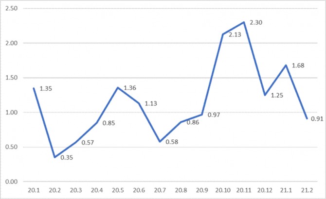 ’20.1-’21.2 터키의 전월 대비 월별 소비자물가지수 변화