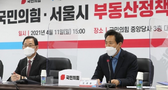 이미지 확대보기오 시장은 서울시장 취임 나흘 만인 11일 소속당인 국민의힘을 찾았다. 방문 이유는 자신의 선거 핵심공약인 부동산 규제 완화에 ‘친정의 도움’을 얻기 위해서다.