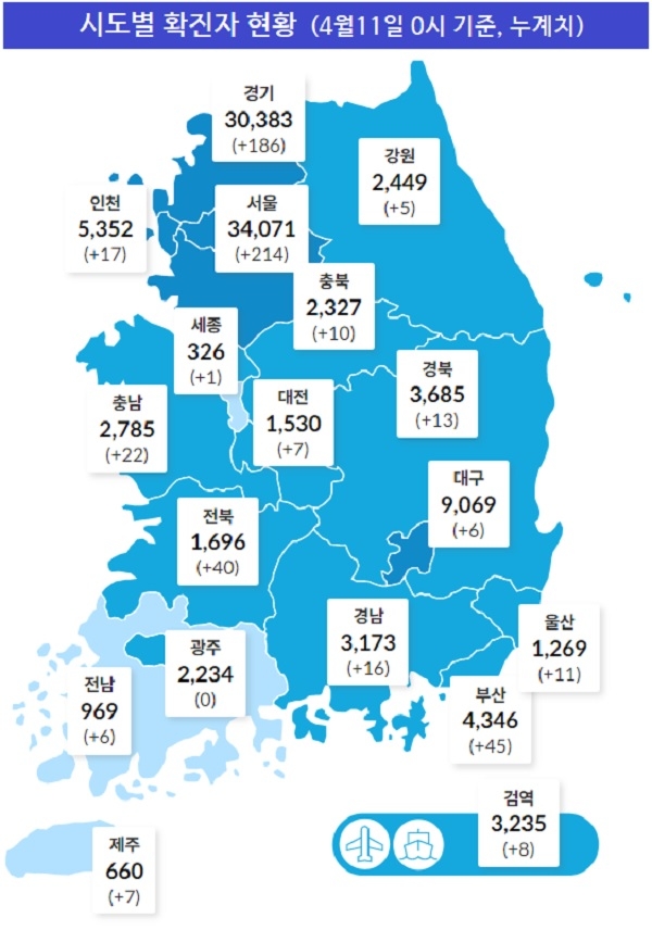 다행히 광주와 세종은 11일 신규 확진자가 아직 보고되지 않고 있는 상황이다.