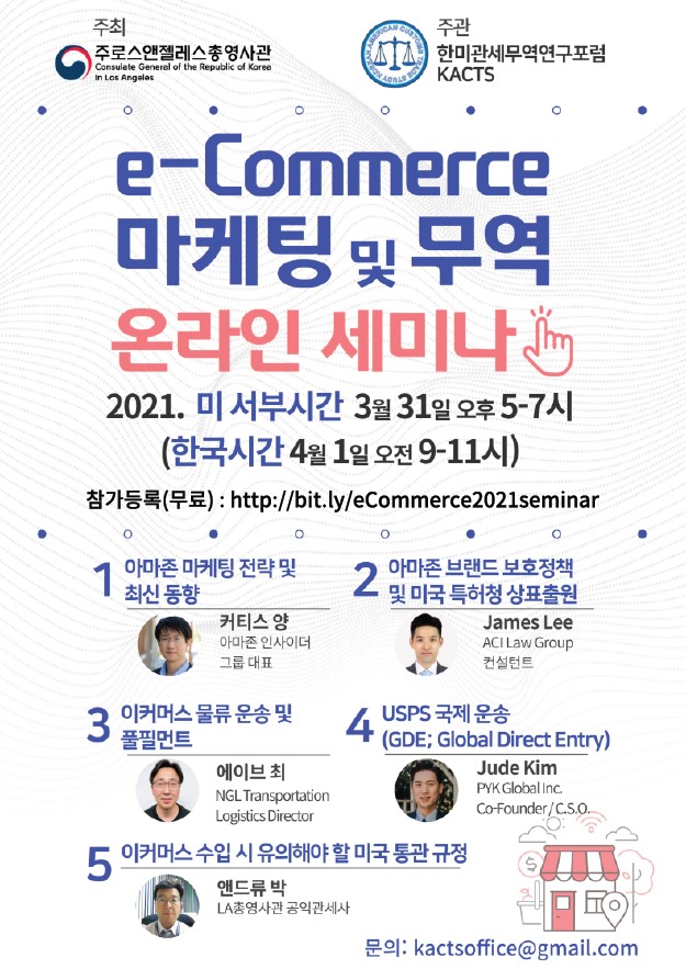 지난 3월 31일, 주로스앤젤레스총영사관과 한미관세무역연구포럼에서는 효과적인 아마존 마케팅부터 브랜드 관리, 물류 운송 및 통관까지 전반적인 이커머스 프로세스에 대한 최근 동향과 유익한 정보를 제공하는 ‘이커머스 마케팅 및 무역’ 온라인 세미나를 성황리에 개최했다. 시기적인 특성으로 인해 비대면 웨비나 방식으로 진행된 본 세미나는 미국 및 한국에서 약 500명 이상이 참가 신청한 바 있으며, 실제로 300명 이상이 참가해 매우 큰 관심을 얻었다. 미국의 대표적인 이커머스 플랫폼인 아마존에서의 마케팅 전략 및 브랜드·상표 보호, 이커머스 물류 및 풀필먼트(Fulfillment), 국제 운송 및 미국의 통관 규정 등 총 5명의 각 분야 전문가가 열띤 강연을 펼친 이번 세미나의 주요 내용을 아래와 같이 다시 한 번 간략히 짚어본다.