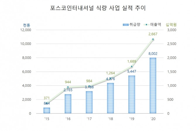 포스코인터내셔널 관계자는 “식량 사업은 사양시장이 아닌 수요가 지속적으로 확대되고 전후방 산업으로 확장이 가능한 성장 시장”이라며 “식량 사업 확대로 메이저 곡물 기업에 버금가는 국제 경쟁력을 갖추고 수익 창출과 식량 안보에 기여하는 등 두 마리 토끼를 잡을 수 있도록 노력할 것”이라고 말했다.