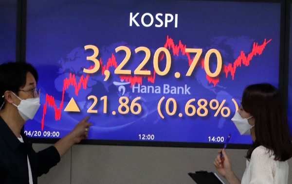 이미지 확대보기이날 한국거래소에 따르면 코스피는 전날 대비 0.68%(21.86포인트) 오른 3220.70에 거래를 마쳤다. 종가 기준 역대 최고치인 지난 1월 25일 3208.99를 3개월 만에 넘어섰다. 이날 장중 고점은 3220.82로 지난 1월 11일 기록한 장중 최고치(3266.23)와 차이가 있다.