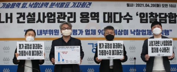 경제정의실천시민연합(경실련)은 지난 20일 서울 종로구 경실련회관에서 기자회견을 열고 지난해부터 올해 3월까지 계약이 이뤄진 LH의 건설사업관리용역 92건을 분석한 결과를 발표했다. 건설사업관리란 건설공사의 기획·설계·사후관리 등의 업무 전반 또는 일부를 맡아 수행하는 업무를 일컫는다.