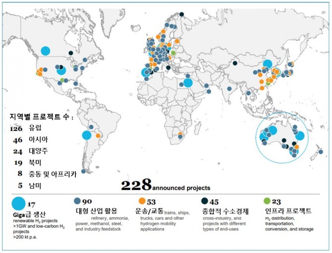 글로벌 수소 위원회(Hydrogen Council)와 맥킨지(McKinsey)가 2021년2월 발표한 수소 인사이트(Hydrogen Insights)에 따르면 전 세계 수소 Value Chain에 따른 프로젝트 분포도에서 호주는 유럽 및 아시아 대비 수소 생산 관련 프로젝트들을 다수 진행중이거나 계획중인 것을 확인할 수 있다.