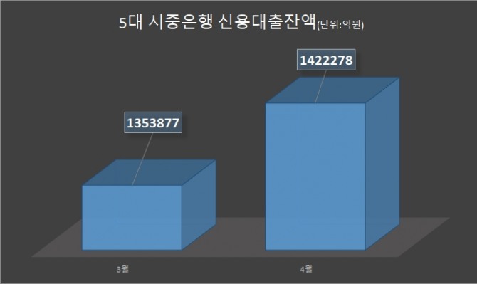 3월말 5대 은행의 신용대출 잔액은135조3877억 원에서 4월말 142조2278억 원으로 6조8401억 원 급증했다.