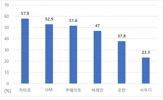 2019년 GCC 6개국 15~64세 여성 인구 중 경제활동 참여 인구 비율