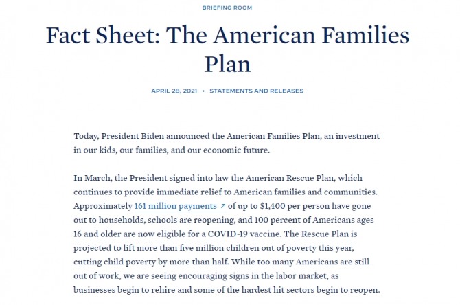 3일(이하 현지시간) CNBC에 따르면 미국의 조세전문 싱크탱크 택스파운데이션은 최근 펴낸 보고서에서 조 바이든 대통령이 지난달 28일 발표한 뒤 최근 미 의회에 부자증세 법안으로 제출한 것으로 알려진 ‘‘미국가족계획(American Family Plan)’ 법안을 검토한 결과 바이든 행정부는 부유층에 대한 자본소득세율을 현행 20%에서 39.6%로 두배가까이 인상하는 부자증세를 계획하고 있는 것으로 나타났다고 밝혔다.