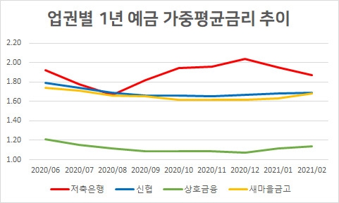 이미지 확대보기7일 한국은행에 따르면 저축은행의 가중평균금리는 지난해 말 2.04%에서 1월 1.95%, 2월 1.87%로 내렸다. 반면 같은 기간 상호금융의 경우 작년 말 1.07%에서 1월 1.12%, 2월 1.14%로 올랐다.