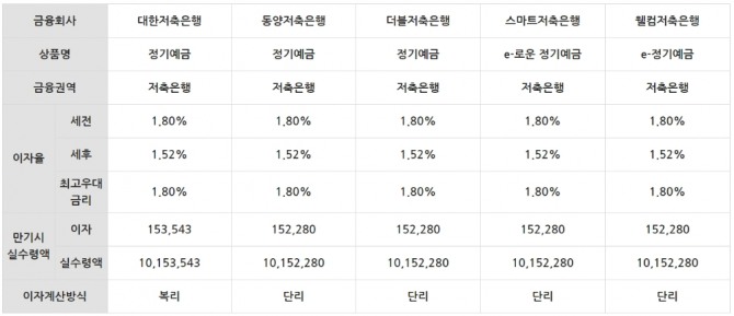 대한저축뿐만 아니라 동양저축은행 '정기예금', 더블저축은행 '정기예금', 스마트저축은행 'e-로운 정기예금', 웰컴저축은행 'e-정기예금' 등도 동일하게 1.8%의 금리를 제공했다.