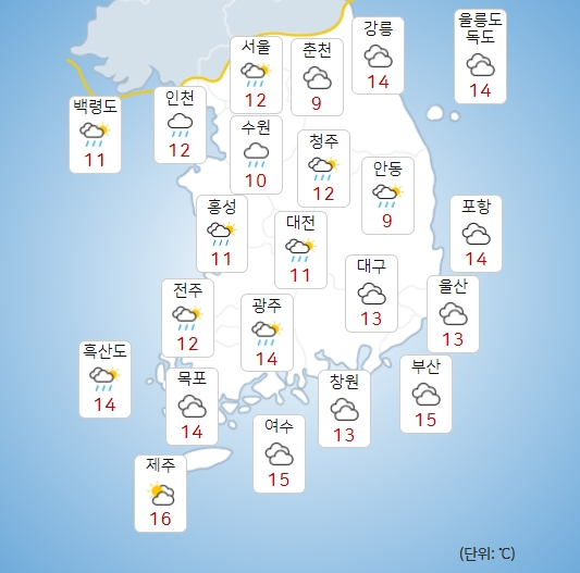 낮 최고 기온은 서울 18도, 인천 15도, 수원 16도, 춘천 19도, 강릉 20도, 청주 17도, 대전 16도, 전주 21도, 광주 24도, 대구 19도, 부산 20도, 제주 24도다.