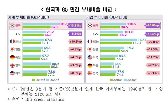 기업의 경우 지난해 3분기 말 현재 우리나라의 DSR은 39.5%로 G5의 41.4%보다 낮았다.
