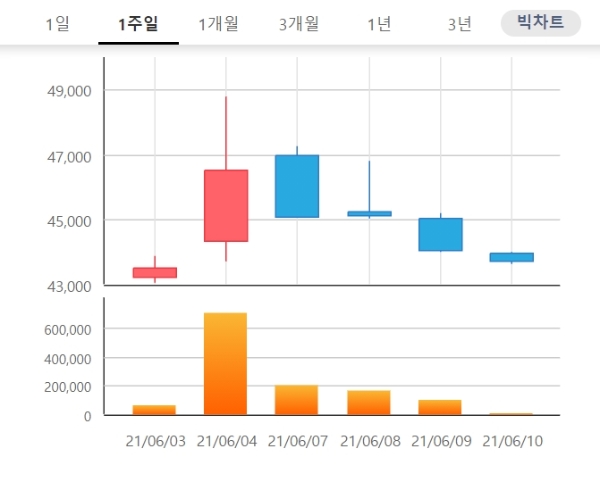 주가는 종가기준으로 2일 4만3200원에서 4만4050원으로 2% 내렸다.