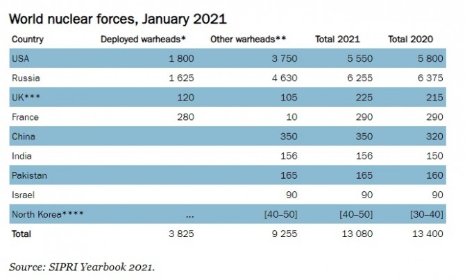 이 가운데 3825개는 작전부대에 실전배치, 2000여 개는 고도의 작전경계 태세로 유지되고 있다고 SIPRI는 밝혔다.