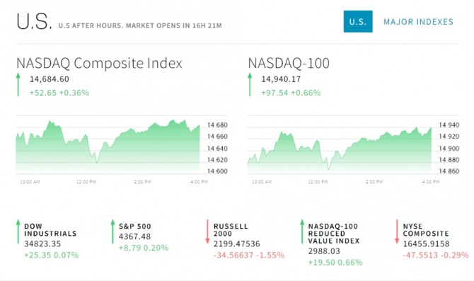뉴욕증시는 주간 실업 지표 등 경제지표 부진 발표에 오히려 기술주가 강세로 돌아섰다. 뉴 증권거래소(NYSE)에서 다우존스30산업평균지수는 25.35포인트(0.07%) 오른 34,823.35로 장을 마쳤다. 스탠더드앤드푸어스(S&P)500지수는 8.79포인트(0.20%) 상승한 4,367.48을 나타냈다. 기술주 중심의 나스닥지수는 52.64포인트(0.36%) 오른 14,684.60으로 거래를 마감했다.