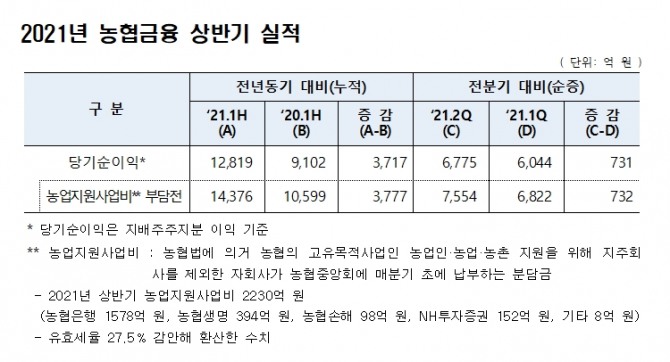 이미지 확대보기NH농협금융은 23일 2021년 2분기 당기순이익 6775억 원을 포함해 상반기 1조2819억 원의 당기순이익을 기록했다고 밝혔다.