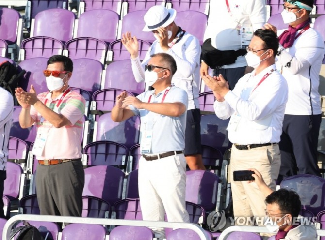 정 회장이 관중석에서 양궁협회 관계자 등과 함께 응원하는 모습이 TV 중계 카메라에 포착됐다.
