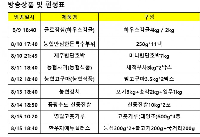 모든 상품은 100% 국내산이다. ▲제주밤단호박 ▲농협고구마 ▲풍광수토 신동진쌀 ▲영월 고춧가루 ▲농협김치 등 5가지 농산물과 ▲귤로장생 하우스밀감 ▲농협사과 ▲농협 안심한돈 특수부위 △농협 한우지예 1++ 등 과일과 육류도 각각 2종씩 판매한다.