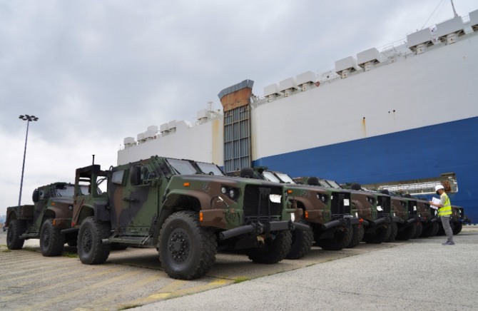 이미지 확대보기미8군사령부는 지난 2일 홈페이지에 8월31일 부산항에서 JLTV를 하역하는 사진 두 장을 올렸다. 한 장은 자동차 운반선에서 JLTV 차량 한 대가 나오는 장면을 담은 사진이고 다른 한 장은 10여 대의 차량이 두 줄로 늘어선 장면을 담은 사진이었다.