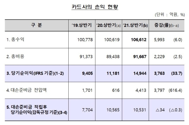 이미지 확대보기금융감독원이 14일 발표한 ‘2021년 상반기 신용카드사 영업실적’에 따르면 8개 전업 카드사의 순이익(IFRS 기준)은 1조4944억 원으로 전년 동기 대비 33.7%(3763억 원) 늘었다.