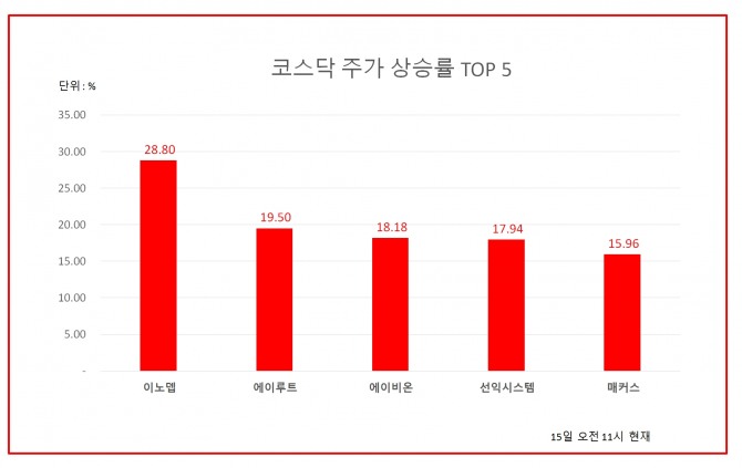 15일 오전 11시 현재 코스닥 상승률 상위 50개 종목은 다음과 같다.