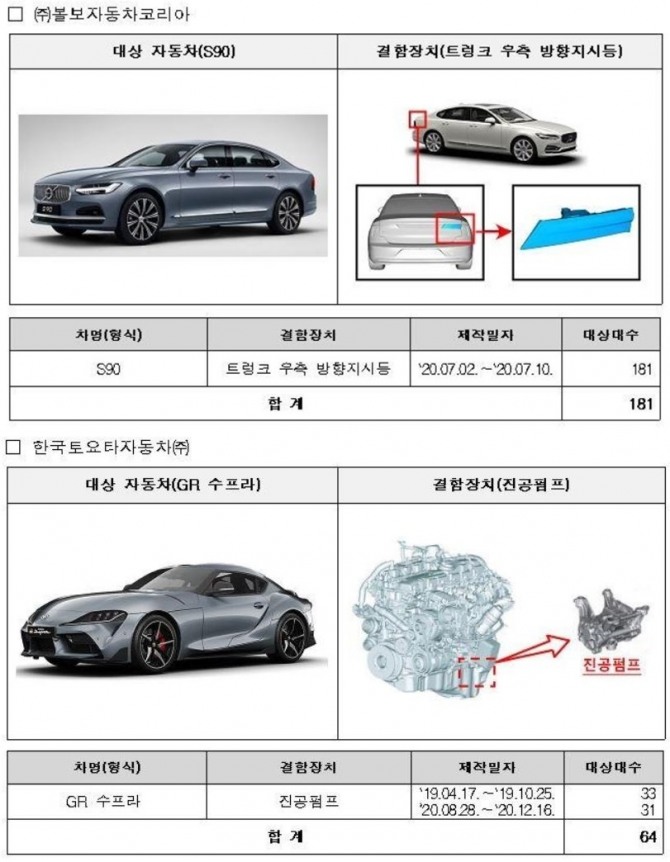 한국토요타자동차의 GR 수프라 64대는 브레이크 진공펌프가 손상돼 브레이크 페달을 밟으면 무거운 느낌이 들고 제동거리도 길어질 수 있다. 이에 따라 돌발사고를 막을 수 있는 기능이 떨어진 것으로 나타났다.
