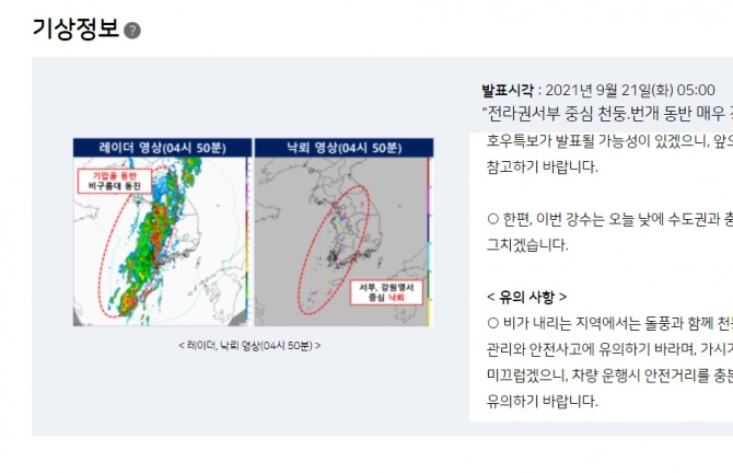 이미지 확대보기기상청은 21일 새벽에 발표한 오늘날씨 특보에서 05시현재 호우특보가 발효중인 전라권서부에 천둥.번개를 동반한 시간당 30mm 이상의 매우 강한 비가 내리는 곳이 있으며 경기남부와 충남서부에는 시간당 20mm 이상의 강한 비가, 그리고 원영서와 제주도에는 시간당 10mm 내외의 비가 내리는 곳이 있다고 밝혔다. 기압골에 동반된 강한 비구름대가 서해상에서 동진하고 있어 수도권과 강원영서, 충청권에는 오늘(21일) 아침까지 시간당 20~30mm 내외의 강한 비가 내리는 곳이 있겠다. 전라권과 제주도는 오전까지, 경상권은 아침부터 낮 사이에 시간당 30~50mm 내외의 강한 비가 내리는 곳이 있겠다. 강한 남풍에 동반된 다량의 수증기가 유입되는 전라권과 경남권, 제주도에는 호우특보가 발표될 가능성이 있겠다고 기상청은 밝혔다. 이번 강수는 오늘 낮에 수도권과 충남권, 전라권을 시작으로 오후에 대부분 그치겠다.