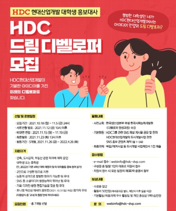 이미지 확대보기오는 18일부터 11월 5일까지 모집하는 ‘HDC 드림 디벨로퍼’ 제1기 과정으로, 대상은 건축·도시공학·부동산 분야 전공 대학생들이다.
