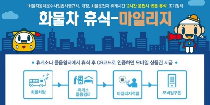 화물차 운전자가 휴식 1회 인증 때마다 10마일리지를 적립해 주고, 총 40마일리지를 채우면 물품 구입·차량 주유에 사용할 수 있는 5000원 상당의 상품권을 제공한다. 운전자들의 졸음 취약시간대인 자정~오전 6시 사이 휴식 인증을 받으면 2배로 적립된다.