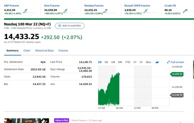 이미지 확대보기이같은 지수선물시세 상승에 대해 뉴욕증시 전문가들은 그동안 나스닥 다우지수 하락이 과도해 반발 저가매수가 일어나고 있는 데다 연준 FOMC가 당초 예상보다 훨씬 약한 단계적 비둘기파적인 긴축 정책을 내놓을 것이라는 분석이 나오고 있는데 따른 것으로 보고 있다.일각에서는 연준 FOMC가 이번엔 기준금리를 동결하고 3월부터 금리를 올리는 쪽으로 방향을 정한 것으로 보고있다.