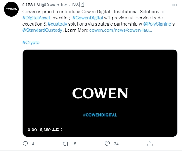 이미지 확대보기월스트리트 투자 은행 코웬이 기관 투자자들에게 현물 비트코인 및 암호화폐 거래를 제공하는 새로운 디지털 자산 유닛을 출시했다.