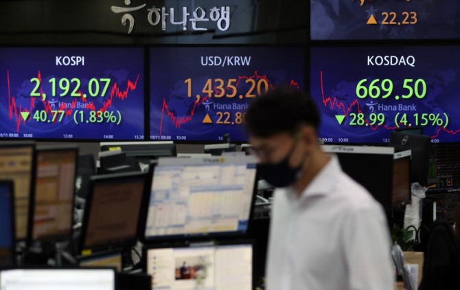 이미지 확대보기11일 한국거래소에 따르면 코스피는 전 거래일 2232.84 대비 40.77포인트(1.83%) 내린 2192.07에 장을 마쳤다. 이날 코스피는 1.78% 내린 2193.02로 출발했다. 한때 2170선까지 내려가 거래되기도 했다.