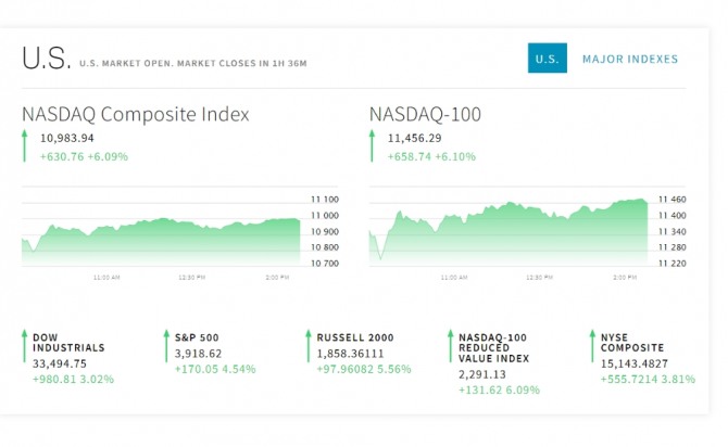 뉴욕증시는 소비자물가지수(CPI)가 예상보다 빠르게 둔화하고 있다는 소식에 폭등했다. 미국 노동부가 발표한 10월 CPI는 지난해 같은 기간 대비 7.7% 올랐다. 이는 지난 9월 기록한 8.2%에서 7%대로 떨어진 것으로 물가상승률이 7%대로 떨어진 것은 2월(7.9%) 이후 처음이다. 상승률은 올해 1월 기록한 7.5% 이후 가장 낮은 수준이다. 이날 수치는 뉴욕증시 예상치인 7.9% 상승도 밑돌았다. 10월 근원 CPI 상승률도 전년 대비 6.3% 상승해 시장이 예상한 6.5%와 전달 상승률 6.6%를 밑돌았다. 9월 수치는 40년 만에 최고치를 경신한 바 있다.